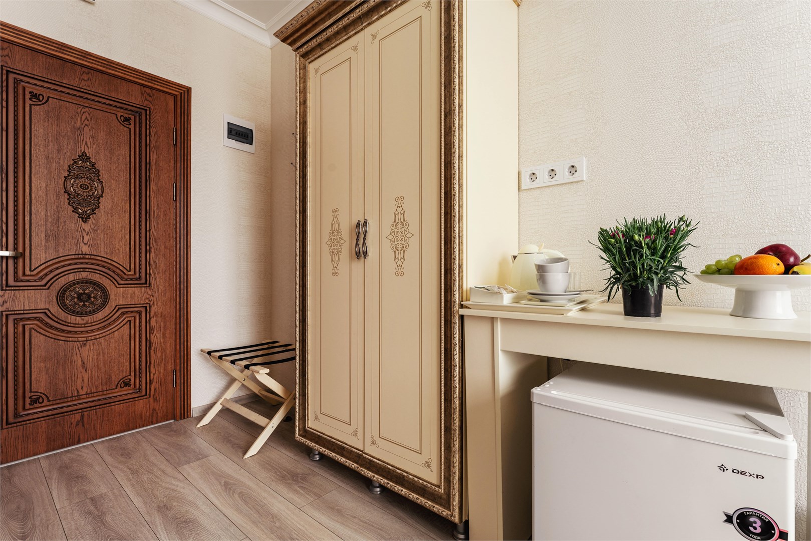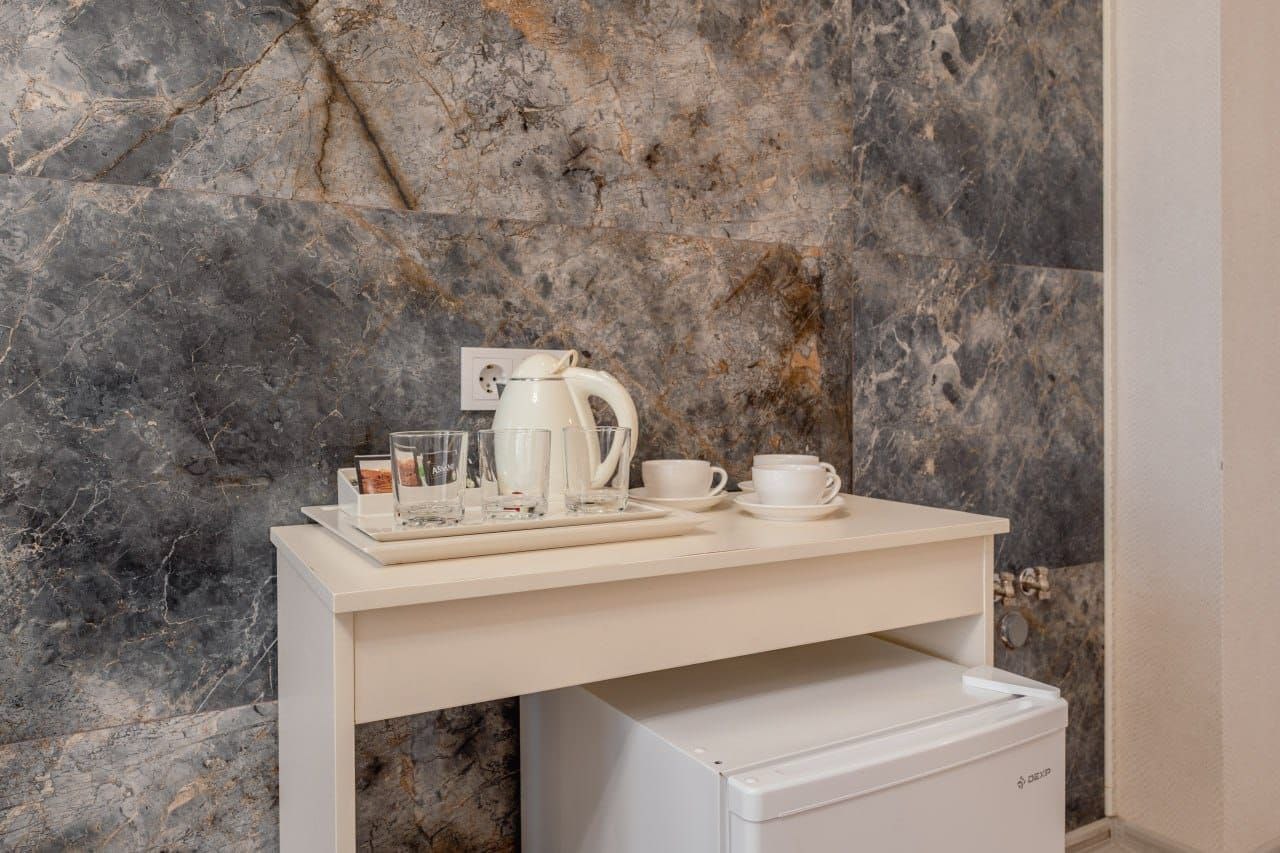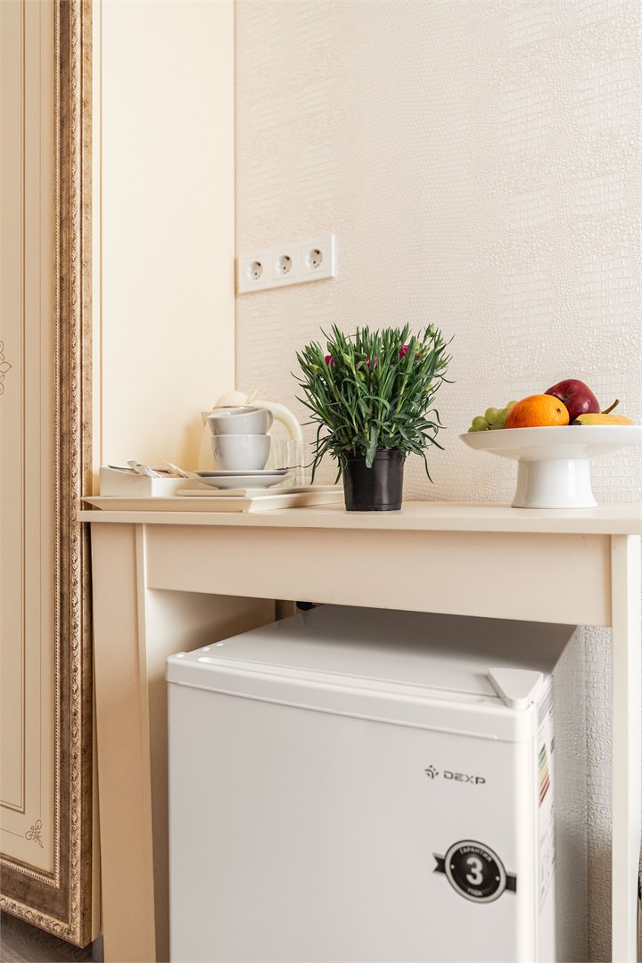- Оборудование: кондиционер, микроволновая печь, мини-холодильник, набор посуды, сейф, телевизор, электрочайник